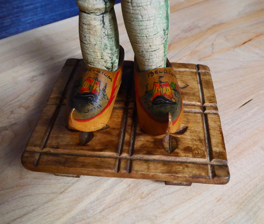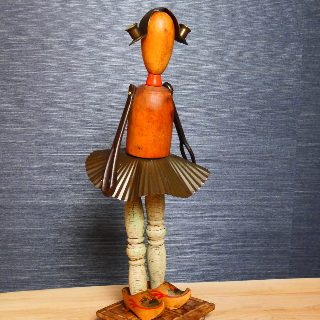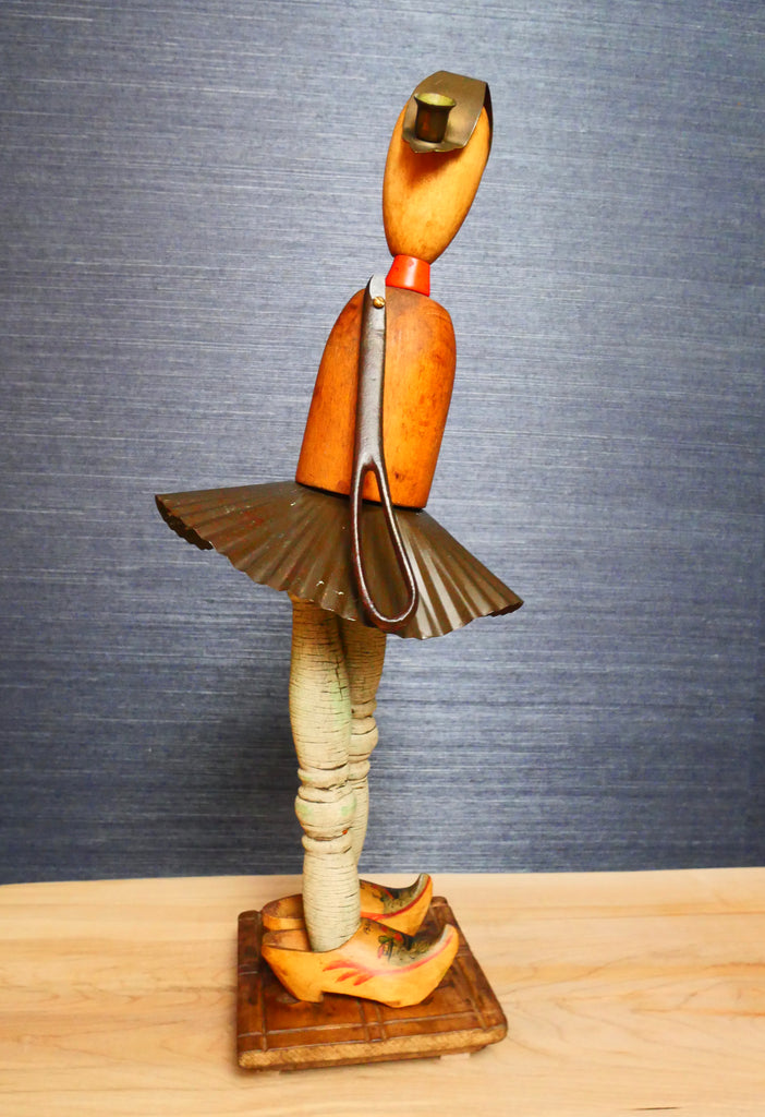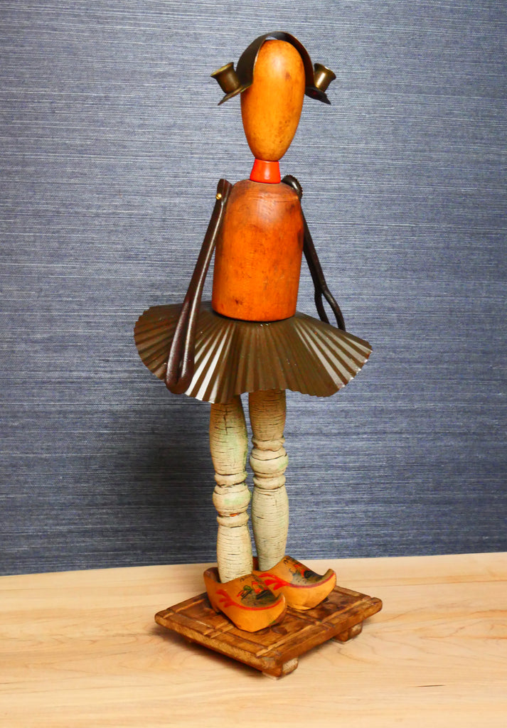 Justin brings his People to life using various bits and bobs from his collection. Among other things, Ingrid wears hand-painted Belgian souvenir shoes, a metal skirt from a vintage pastry tool and brass candleholder buns.