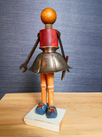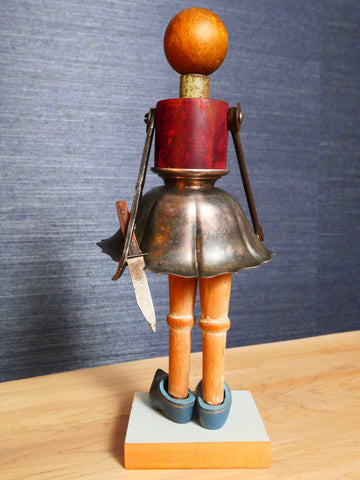 Justin brings his People to life using various bits and bobs from his collection. Among other things, Toni dons hand-painted Dutch shoes, wears a silver plate skirt and is holding a knife from her arms made of vintage tools.